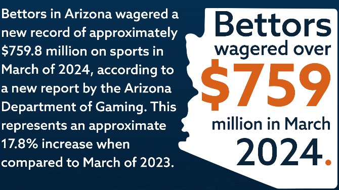 The Arizona Department of Gaming has released the sports betting wagering totals for March of 2024, reporting a new record with $759.8m wagered throughout the month. Online gaming accounted for the vast majority of the handle, with bettors having placed $752.4m in bets through online sportsbook apps.