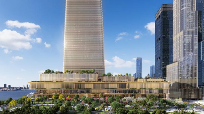 Featured as part of the plan is an 80-story rose gold gaming facility and hotel tower on the banks of the Hudson River, with a four-story base of office buildings, apartments and a 5.6-acre park which would encircle the tower.