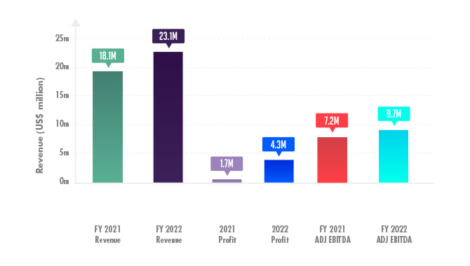 Adjusted EBITDA for 2022 increased 34% to $9.7m. Profit before tax for the year increased 224% to $4.3m. The group also posted a year-on-year revenue increase of 50% for the first quarter of 2023.