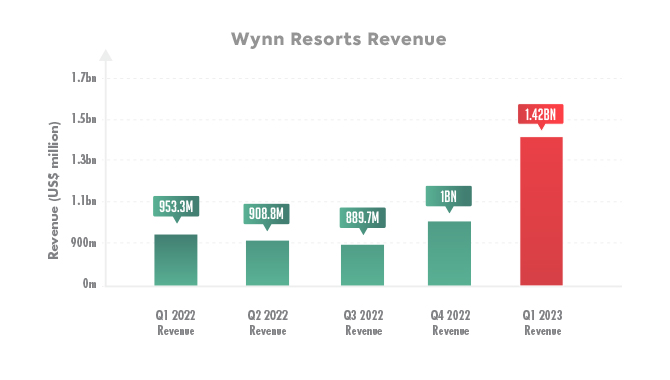 Casino operator Wynn Resorts has reported that its revenue for Q1 2023 was $1.42bn, up 49% from 2022’s Q1 results.