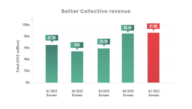 Better Collective reflected increases in all of its key segments, with total revenue, EBITDA and net profit on the increase, with North America also reflecting strong percentage rises for Q1 2023.