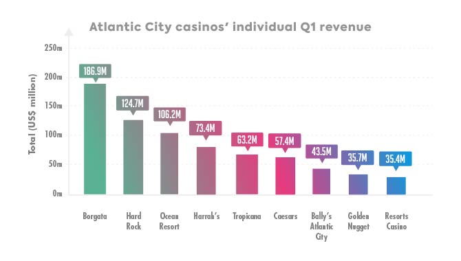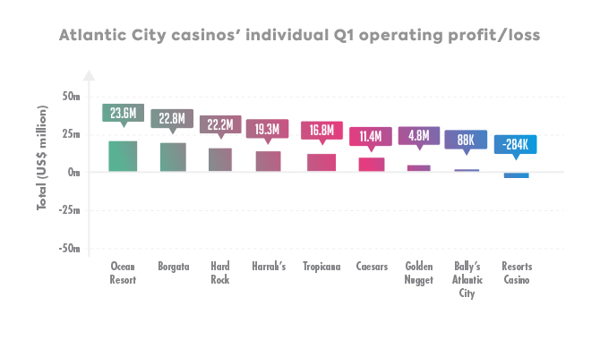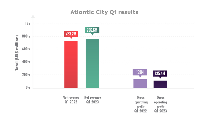 Atlantic City has released its nine casinos’ and overall industry figures for Q1 of this financial year. The gaming destination has seen its gross operating profit decline 14.8% year-on-year, though revenue has increased 4.6%.