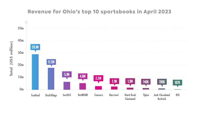 Rounding out the top five sportsbooks in Ohio, and bringing in much less market share of the revenue, we have bet365 with $5.1m, BetMGM with $4.8m and Caesars with $2.2m. Buckeye betting brand, Columbus Crew by Tipico, made it eighth-place, with revenue of around $740,000.