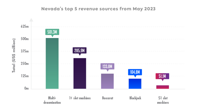 The top five revenue sources in non-restricted locations within Nevada during May 2023 were: blackjack, one-cent slot machines, $1 slot machines, baccarat and multi-denomination slots.
