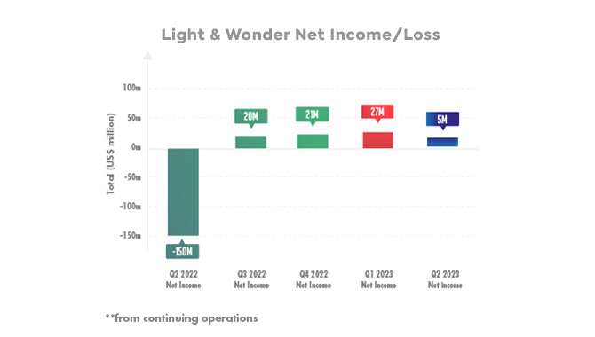 Light & Wonder’s continuing operations generated net income of $5m, compared to a net loss of $150m in Q2 of 2022. Q1 generated $27m from the company’s continuing operations, however.