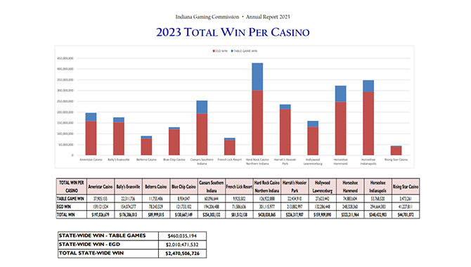 Table games made up $460m of the state’s total $2.47bn win. Hard Rock Casino Northern Indiana and Horseshoe Hammond were the two top properties for table game win, bringing in $126.9m and $74.9m, respectively.