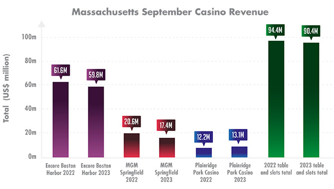 The casino that performed the best this month was Encore Boston Harbor, generating $59.8m, though this represents a decline from $61.6m in September 2022. MGM Springfield’s total revenue also declined year-on-year to $17.4m, but Plainridge Park Casino’s rose slightly to $13.1m.