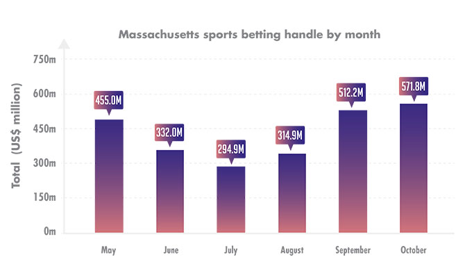 Massachusetts pulled in total taxable gaming revenue of $155.8m for October, up 11% from last month. This month also reflects the highest sports betting handle the state has generated in the year so far, at $571.8m.