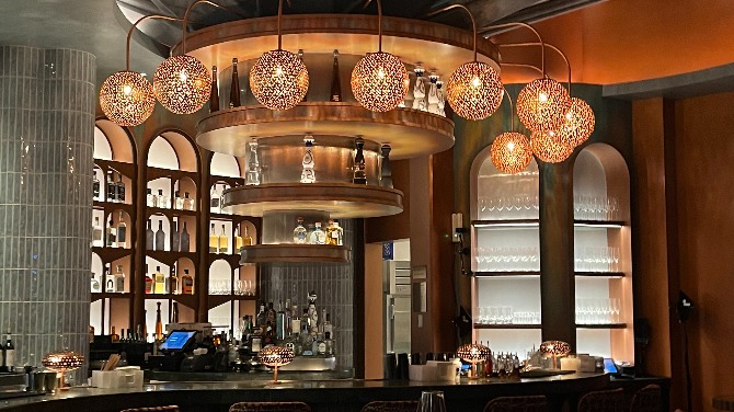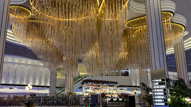 White marble and deep blue fabrics spread throughout the property, evoking an almost ocean-like feel in the sprawling building, with its impossibly high scalloped ceilings that seem to mimic waves. Seemingly everywhere you look, the resort’s signature bowtie motif is incorporated in the marble, the carpet, the gold light fixtures and crystal chandeliers, giving the 173,000-square-foot gaming area and surrounding spaces just a little touch of whimsy to go with its over-the-top grandeur.